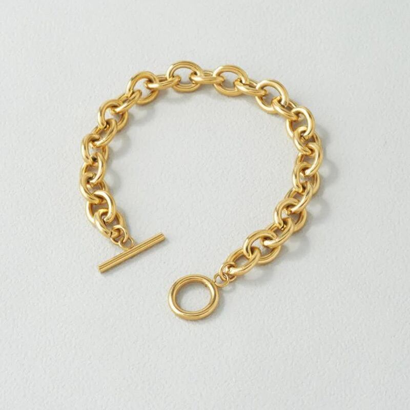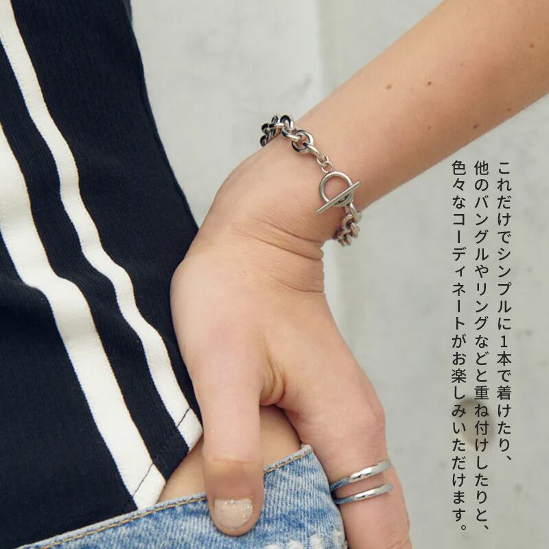 シンプルでトレンド感のあるチェーンブレスレットは、金具がマンテルタイプで着脱しやすく、またデザインのアクセントに。