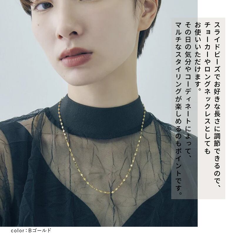 スライドビーズでお好きな長さに調節できるので、チョーカーやロングネックレスとしてもお使いいただけます。その日の気分やコーディネートによって、マルチなスタイリングが楽しめるのもポイントです。